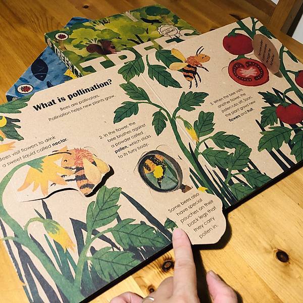 那授粉到底是什麼意思呢?還有授粉對植物來說可以帶來什麼樣的效果呢?簡明的介紹搭配翻頁的說明,閱讀起來相當有趣。再來這系列翻頁的手感很好,翻頁裡的插圖也相當迷人,像是下面蜜蜂的腳沾上花粉的圖片真的是細緻又可愛呢!!