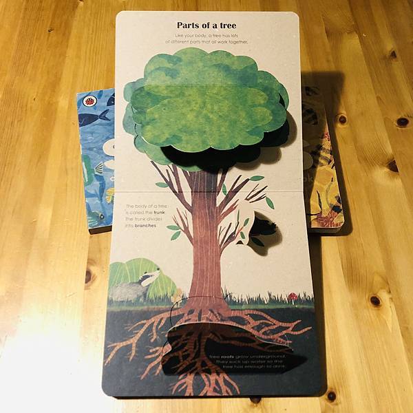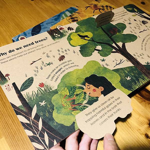 再來看看樹木這本~樹木為甚麼重要呢?樹木可以製造氧氣,可以做為動物的棲息地,還是我們人類製作物品的原料呢!